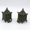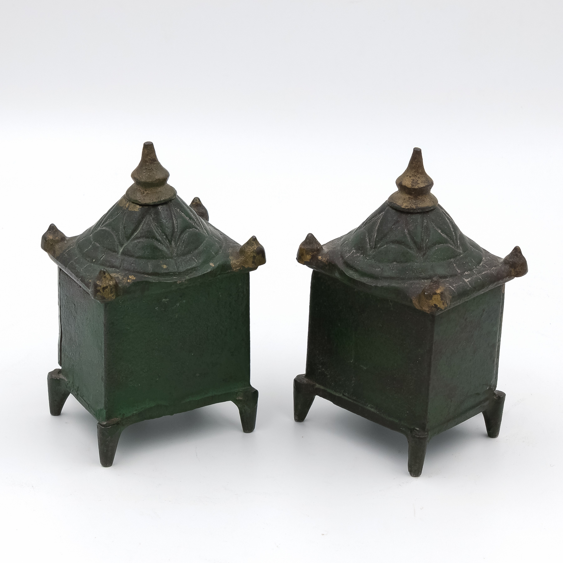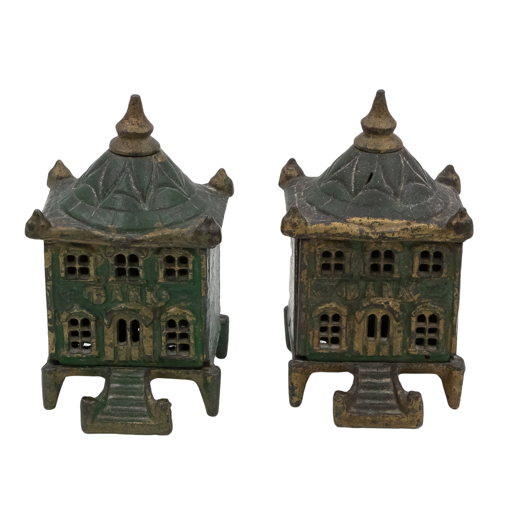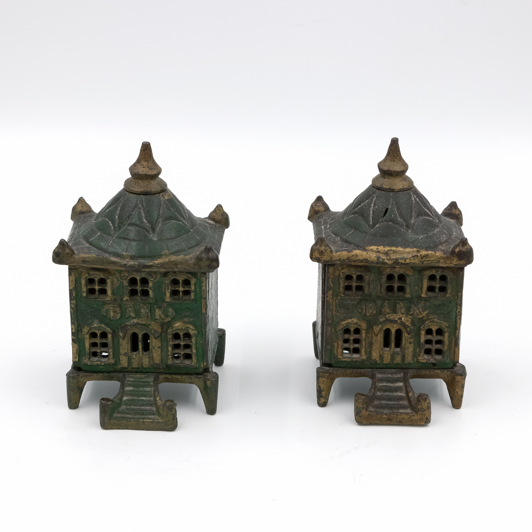 A Pair of antique painted cast iron coin architectural still banks with most of their original green paint; English circa 1880. Sold as a pair. 1