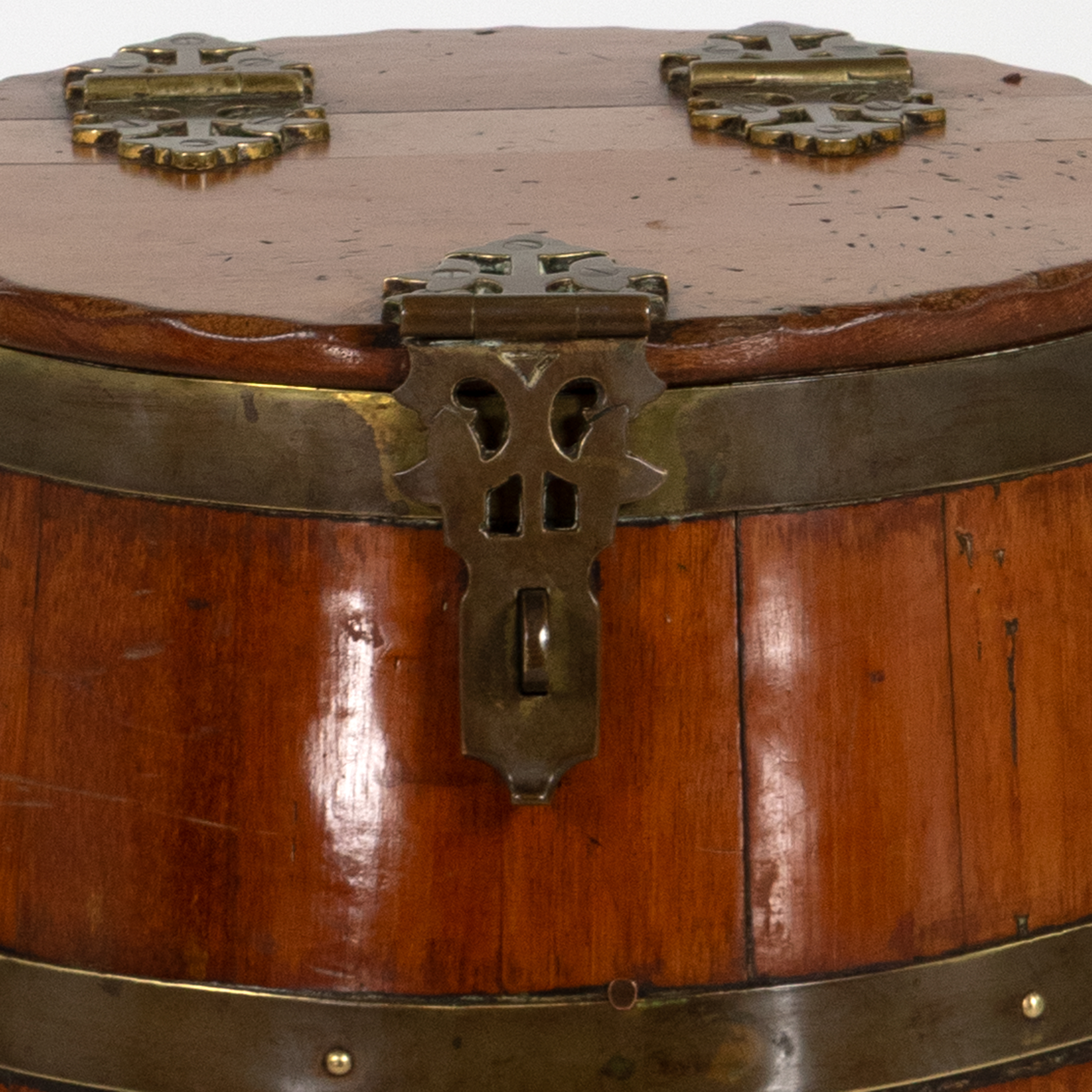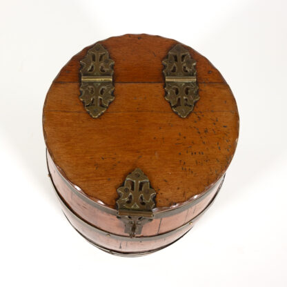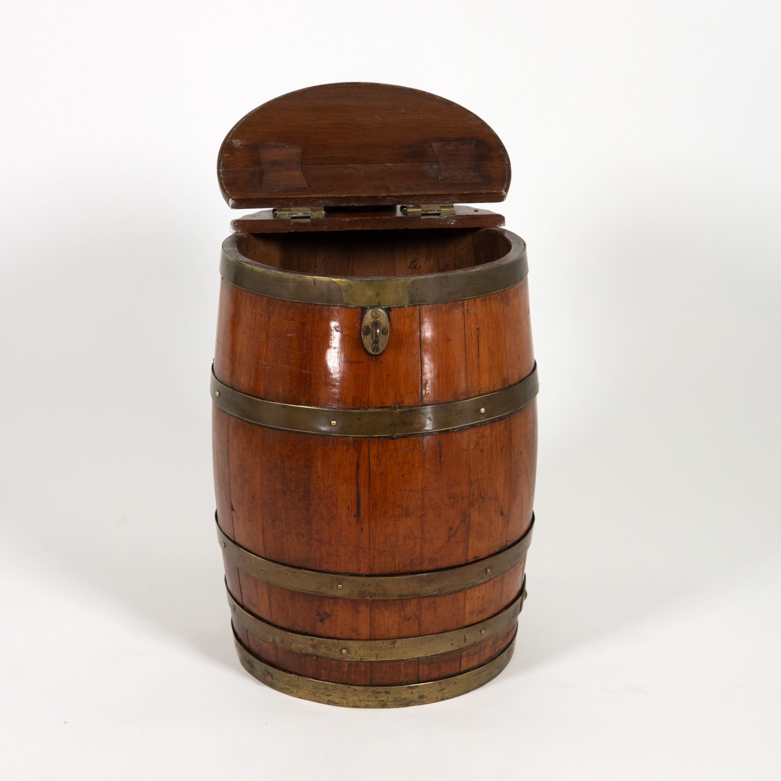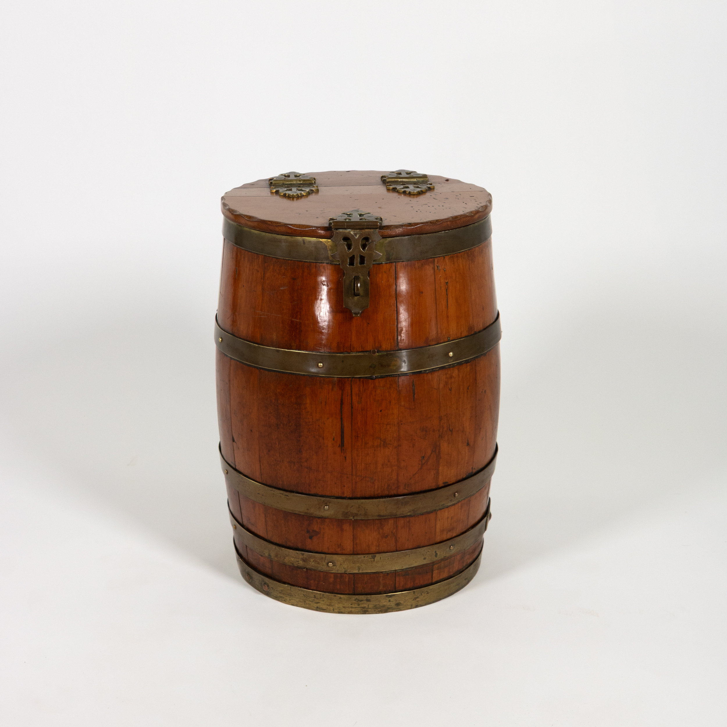 A Victorian period English coopered rum barrel in stained fruitwood, bound with five riveted brass straps. The flat, circular lid is mounted with pierced brass hinges and a clasp, lifting to reveal an open interior. Brasswork shows age-related oxidation. The interior retains surface markings consistent with prior use. Constructed with vertical staves and traditional brass hooping. Circa 1880.