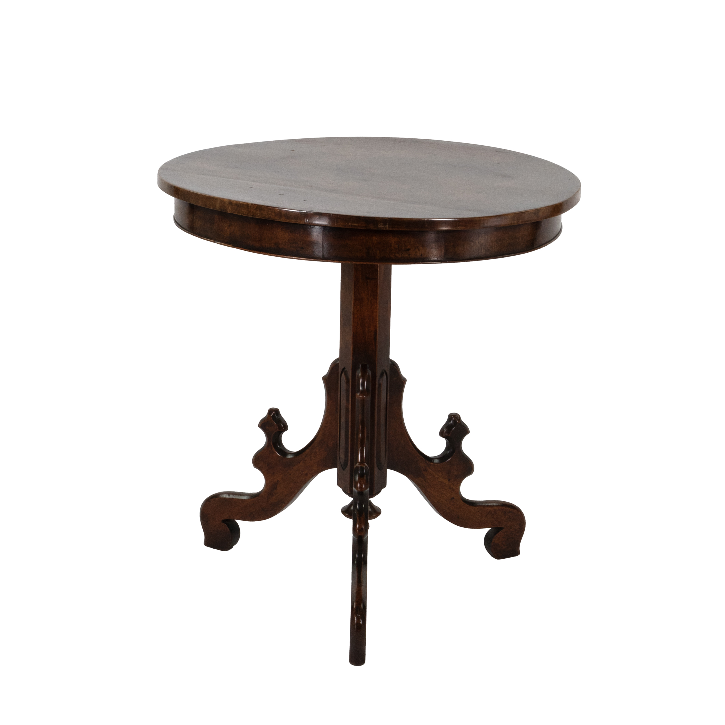 A Victorian side table with round walnut top exhibiting a rich patina, supported by a central columnar base that transitions into three elegantly carved legs. Each leg is embellished with a scrolled acanthus motif terminating with a snail foot. English circa 1860. height: 22 in. (56 cm.),