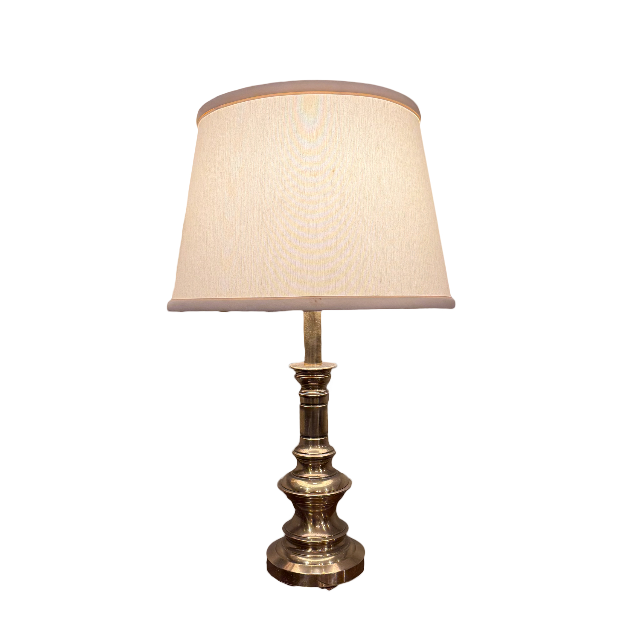 A vintage brass table lamp with circular brass base and slender column rising to a single socket. Shade shown with an approximate 15.5 in. diameter.